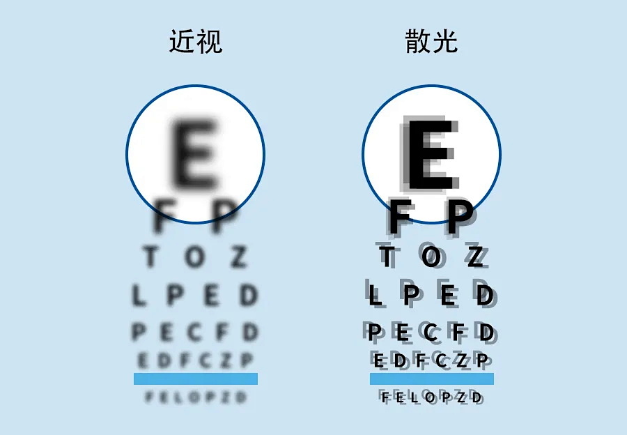 通俗來講,散光就是看遠近物體都不清楚,光線散開了,光線進入眼球以后,它不能聚成一個焦點,導致看東西會有光圈、重影、變形的狀態(tài)。